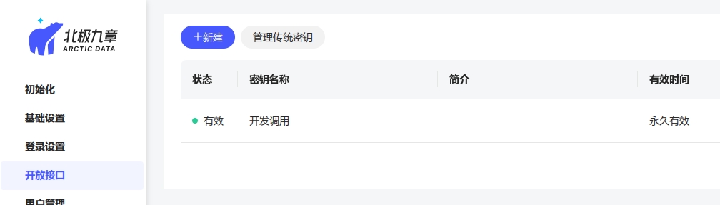 开放接口模块,点击"新建密钥",开启 API 调用功能